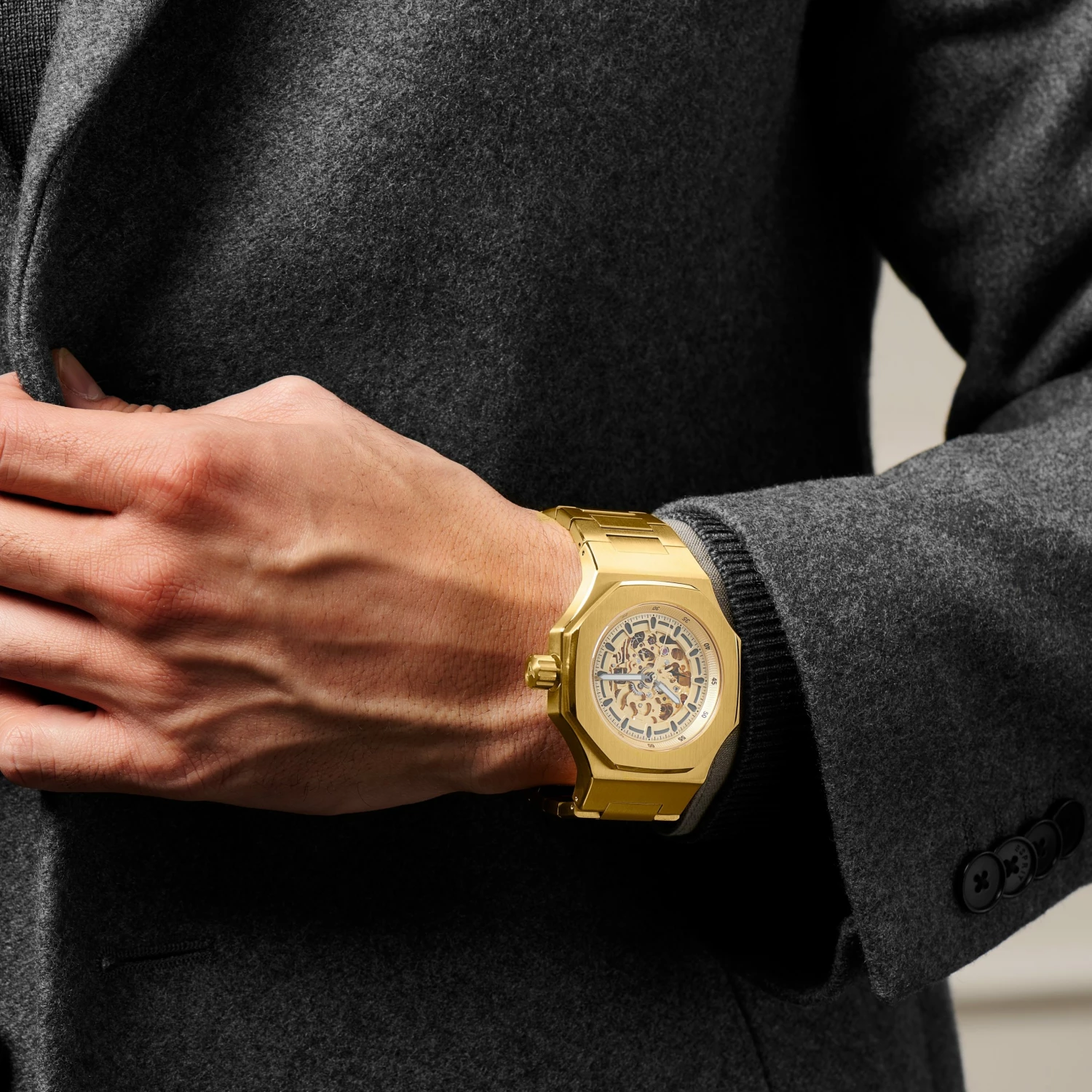 Avec un boîtier en acier inoxydable de qualité chirurgicale doré de 44 mm, cette montre à remontage automatique est prête à vous aider à raconter votre histoire. Et avec un fermoir déployant, un verre saphir résistant aux rayures, un mouvement de précision Miyota 8N24 et un mécanisme exposé, vous serez prêt à la raconter avec style.