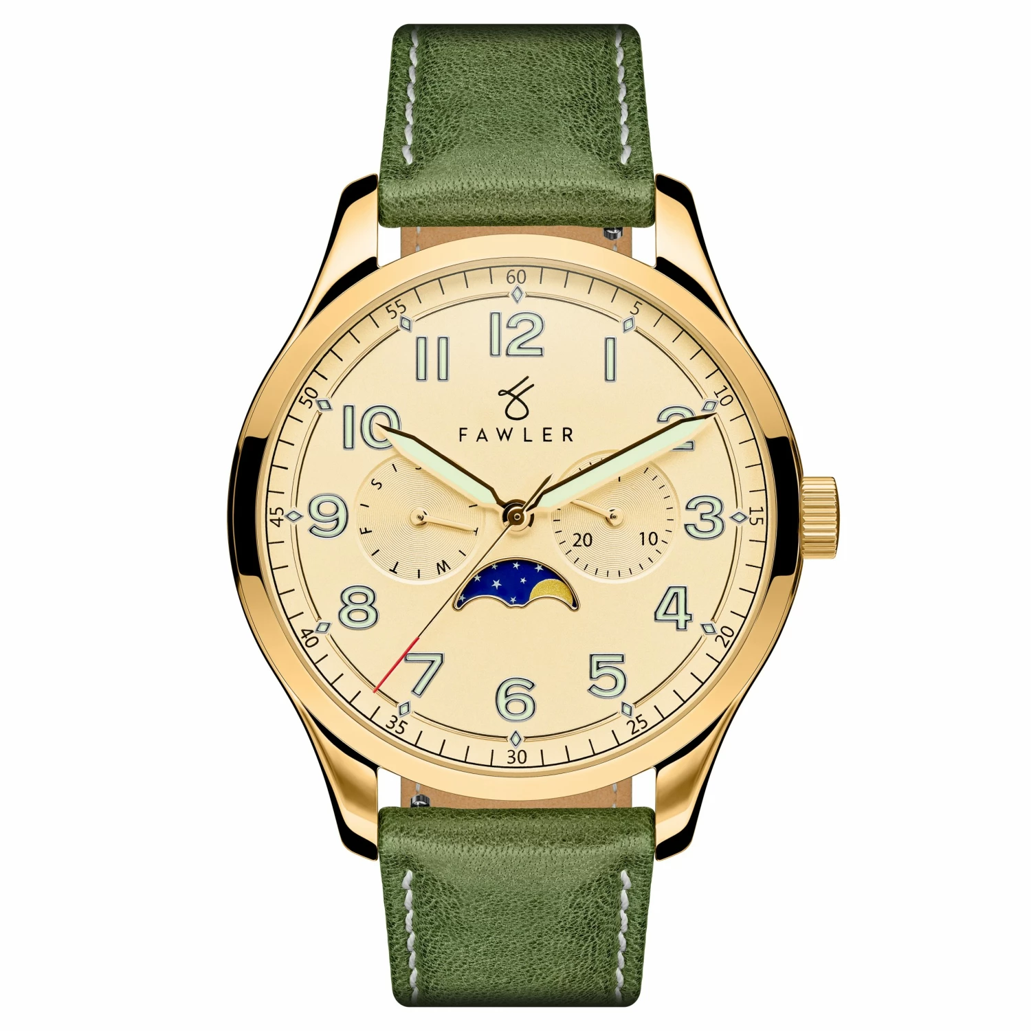 Aiguilles et chiffres qui brillent dans le noir vous permettant de lire l’heure même en pleine obscurité et sous-cadran à phases de lune pour un look intemporel.