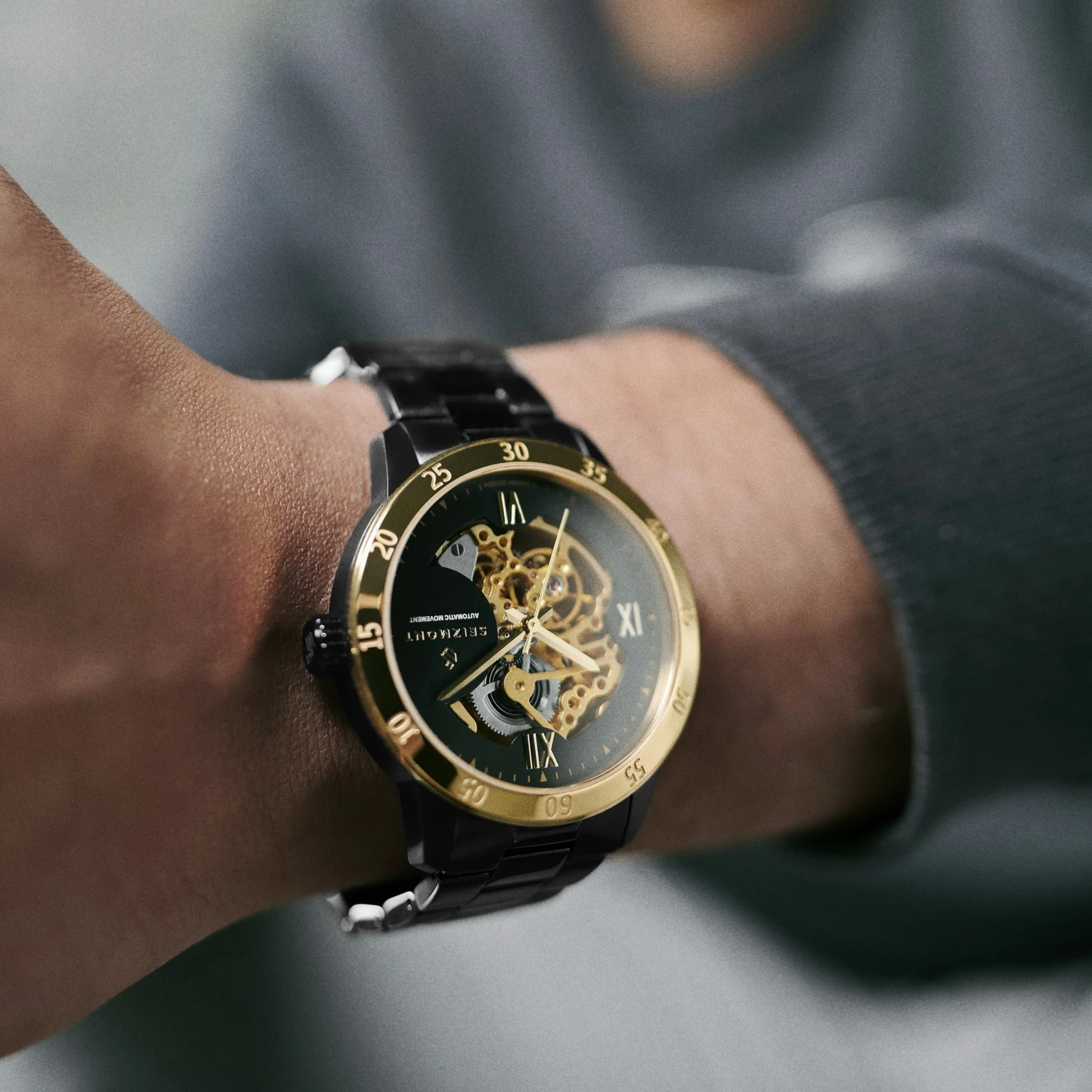 Seizmont Dante II | Montre squelette couleur noir et or à mécanisme doré