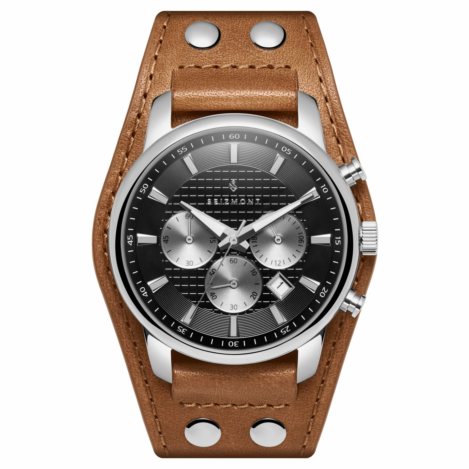 Seizmont Iphios | Montre chronographe noire et brune en acier inoxydable avec bracelet manchette en cuir