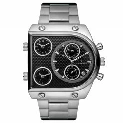 Présenté dans des tons argentés élégants, avec un bracelet métallique à boucle déployante. Le boîtier de la montre abrite 3 mouvements à quartz distincts.