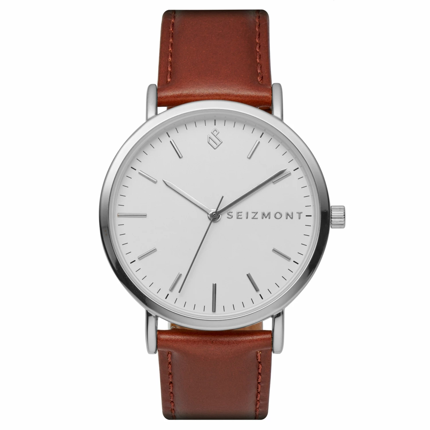 Son discret logo vient décorer un cadran blanc au design sobre, serti au sein d’un boîtier des plus sveltes. Des détails de finition argentés et un bracelet en cuir marron viennent compléter cet ensemble.