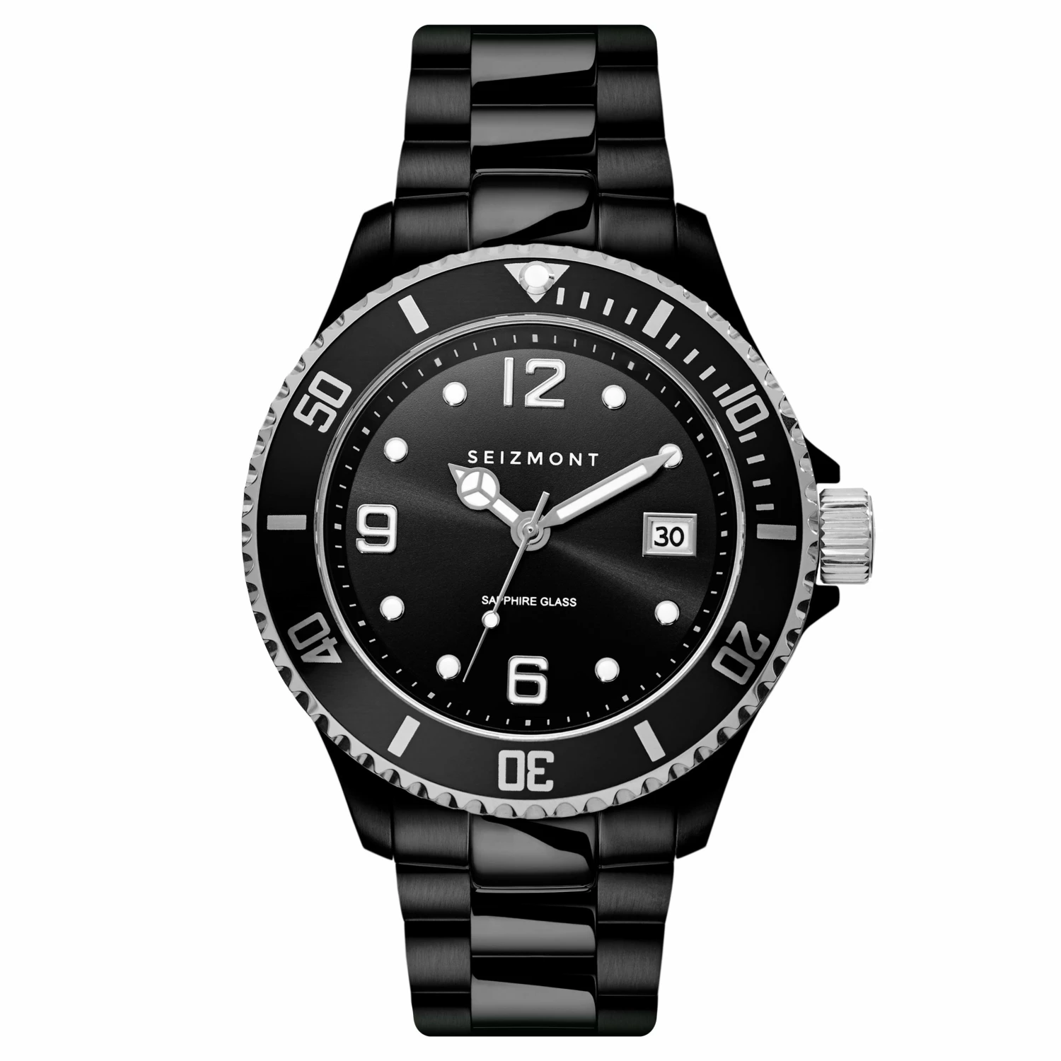 Le cadran noir est logé dans un boîtier argenté de 42 mm et orné d’aiguilles et de marqueurs luminescents. La fenêtre de date est facile à lire en tout temps.