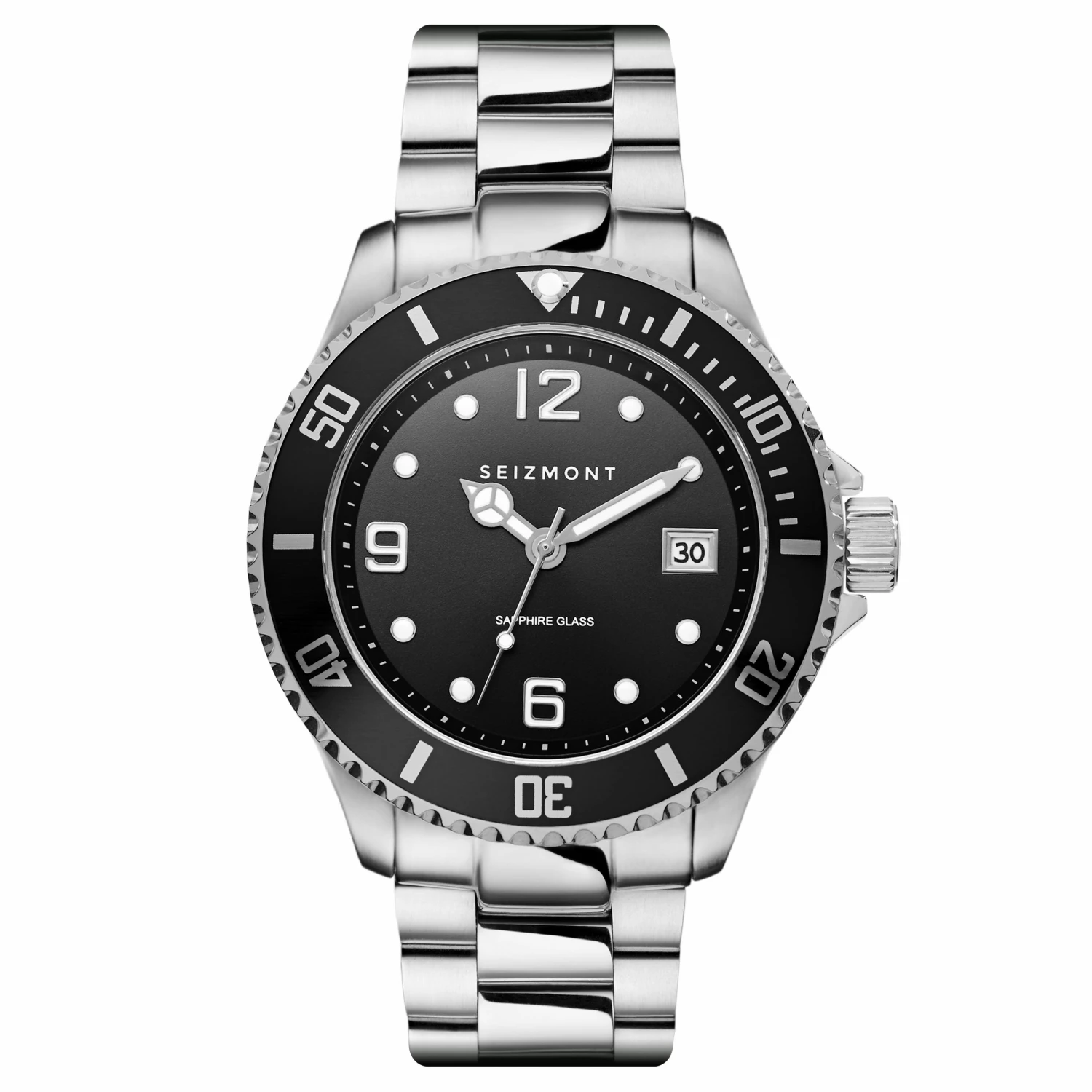 Fabriquée en acier inoxydable de qualité chirurgicale avec un verre saphir et une lunette noire graduée. Le cadran noir comporte des aiguilles et des index luminescents et une fenêtre de date à 3 heures.