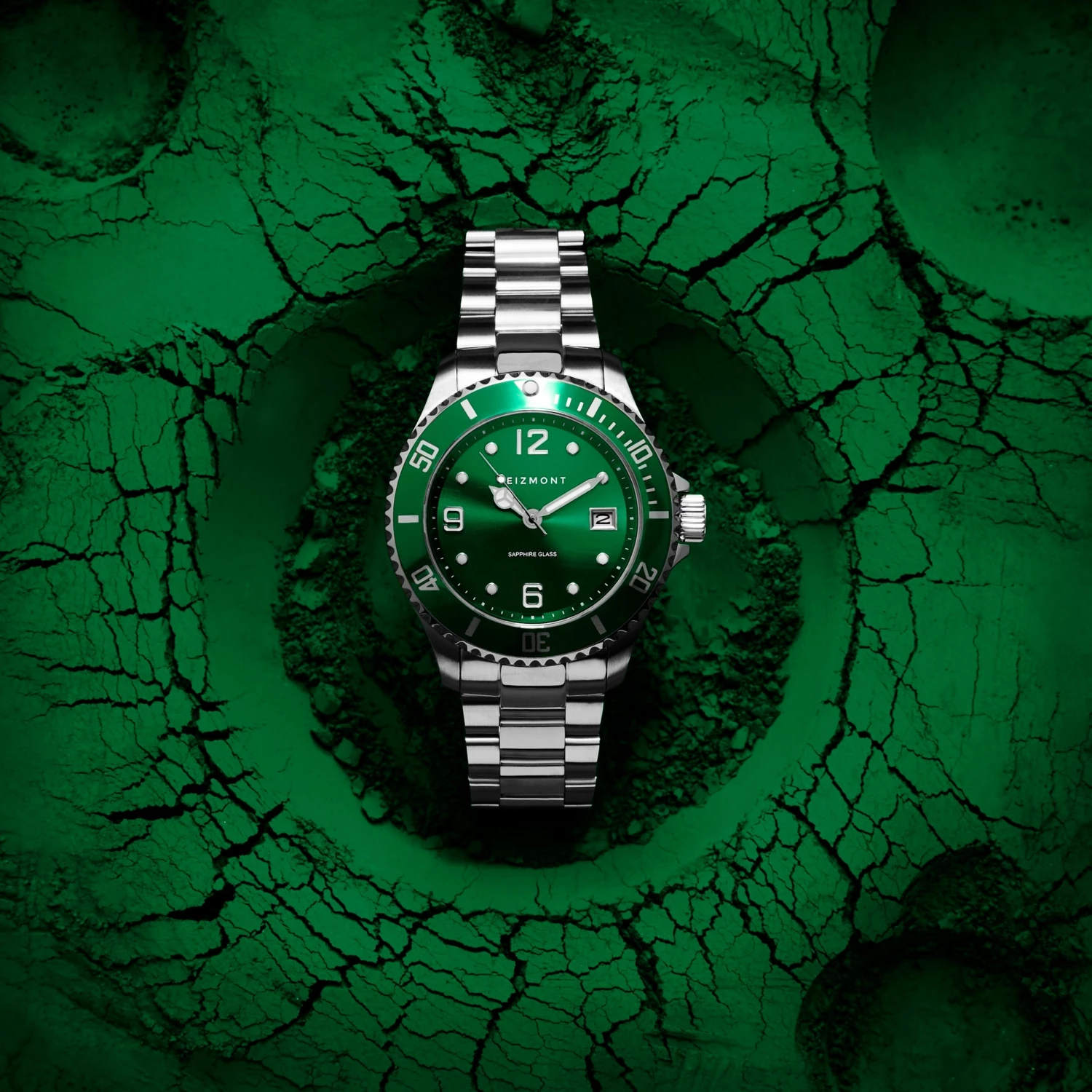 La lunette graduée verte saisissante attire l’attention sur le cadran assorti avec des aiguilles et des marqueurs de cadran luminescents. Complète avec une fenêtre de date à 3 heures et un fermoir déployant facile à utiliser sur le bracelet en acier inoxydable.