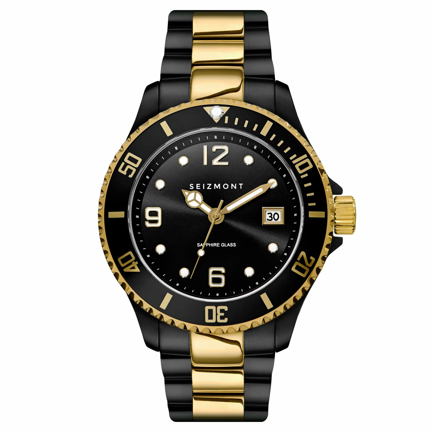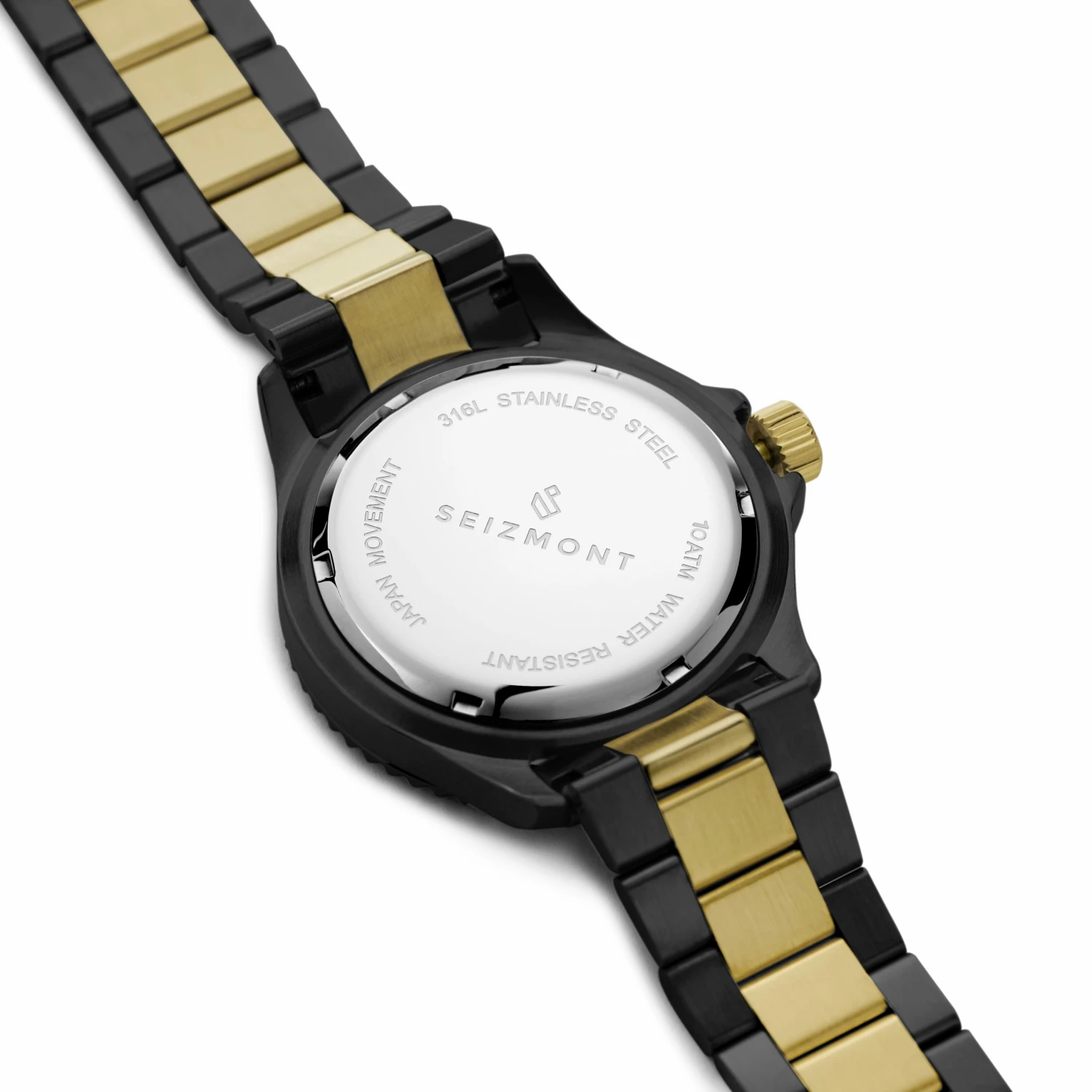 Cette montre pour homme noire et dorée est animée par un mouvement à quartz Miyota 2315 fiable et conçue en acier inoxydable robuste de qualité chirurgicale avec un verre saphir résistant aux rayures.