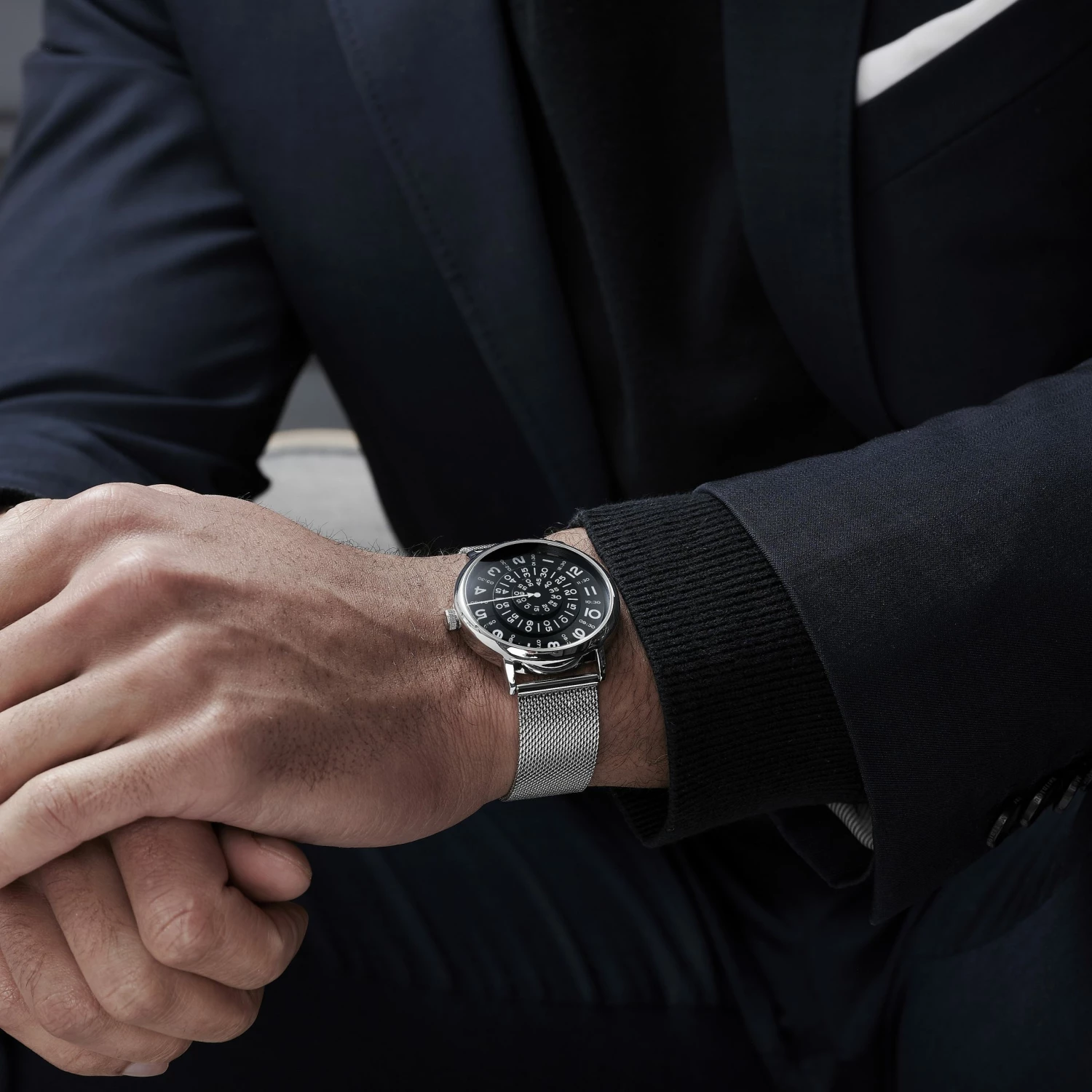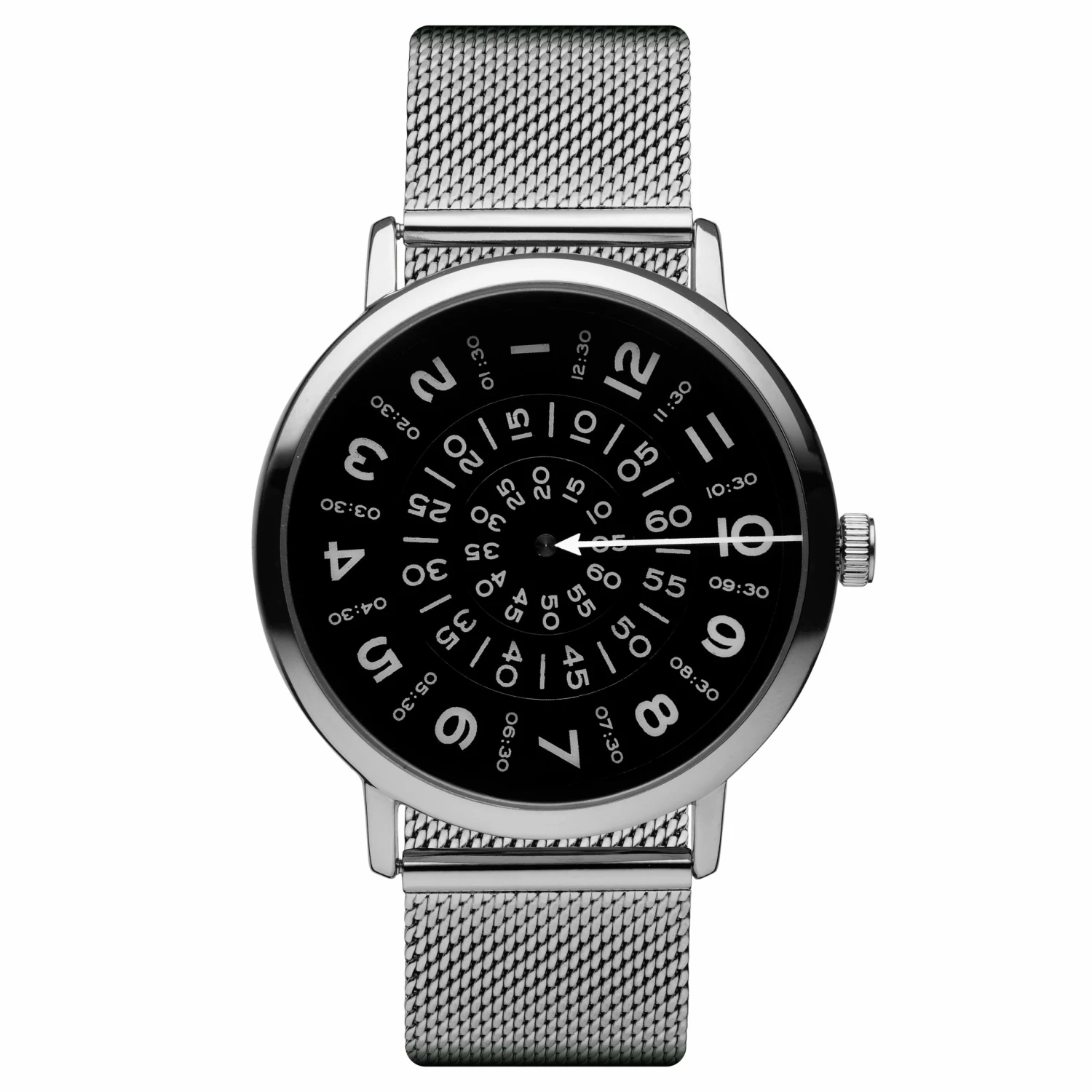 Contrairement aux montres traditionnelles, ce modèle noir et argent est équipée d’une aiguille fixe autour de laquelle tournent trois cadrans rotatifs. Le temps ne s’arrêtera plus jamais.