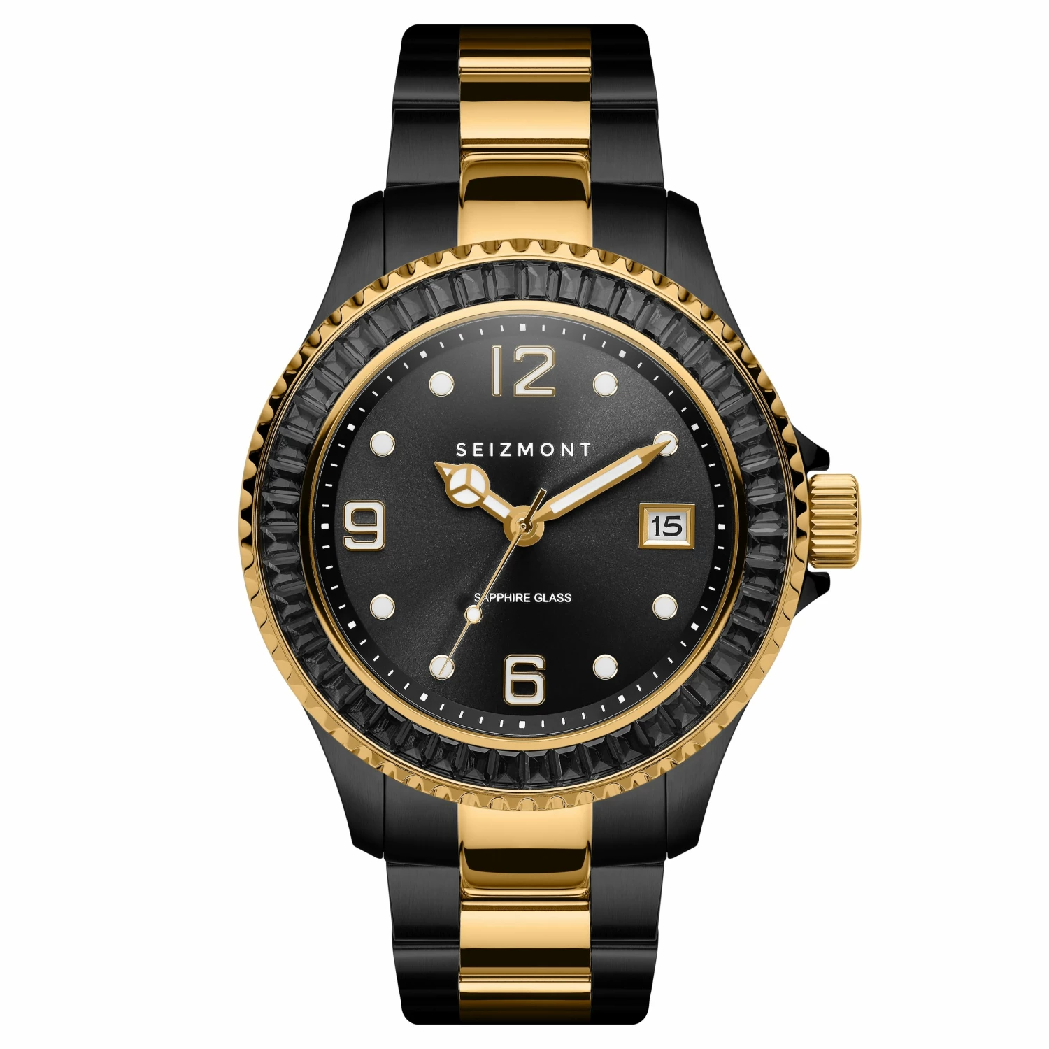 Son bracelet en acier inoxydable 316L couleur noir et or est équipé d’une robuste boucle déployante réglable qui maintiendra son boîtier de 42mm en toute sécurité autour de votre poignet.